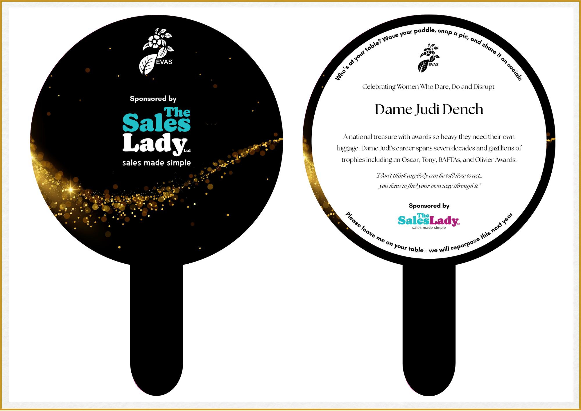 Our EVAS Inspirational Women Paddles celebrate trailblazers across science, sport, arts, enterprise and public life. Each paddle is matched to its table, so every guest sits with a woman whose story reflects their sector, passion or purpose. It’s not random; it’s curated.