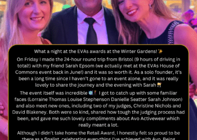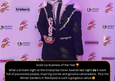 “What a mad brilliant night at Winter Gardens in Blackpool at EVAS awards. So honoured to be finalist in Business woman category and Outstanding Achievement award.