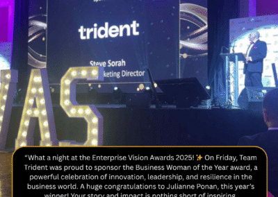 “What a night at the Enterprise Vision Awards 2025! ✨ On Friday, Team Trident was proud to sponsor the Business Woman of the Year award, a powerful celebration of innovation, leadership, and resilience in the business world. A huge congratulations to Julianne Ponan, this year’s winner! Your story and impact is nothing short of inspiring.