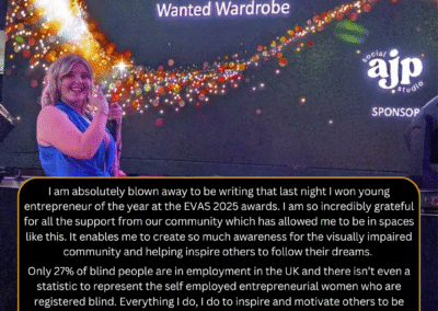 I am absolutely blown away to be writing that last night I won young entrepreneur of the year at the EVAS 2025 awards. I am so incredibly grateful for all the support from our community which has allowed me to be in spaces like this. It enables me to create so much awareness for the visually impaired community and helping inspire others to follow their dreams.
